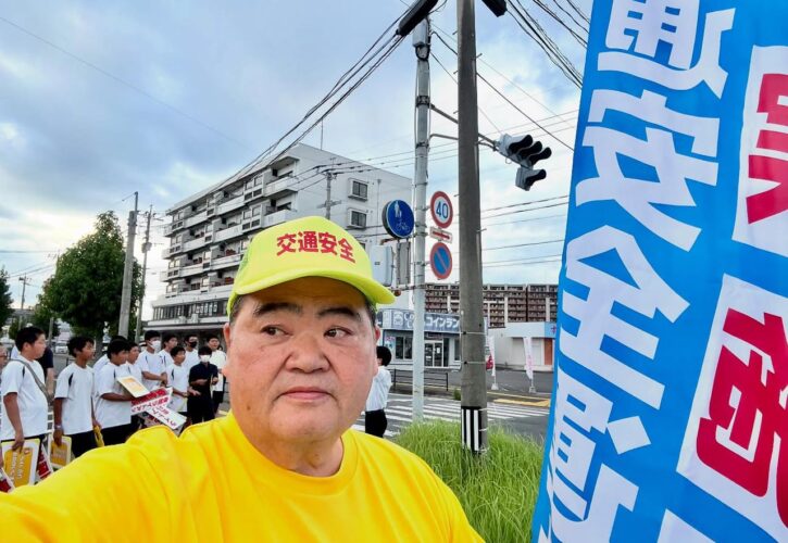 秋の交通安全週間にあたり、杵築地区の分会長として杵築中学校の生徒さん達と街頭で『早めのライト点灯』への呼びかけをしました